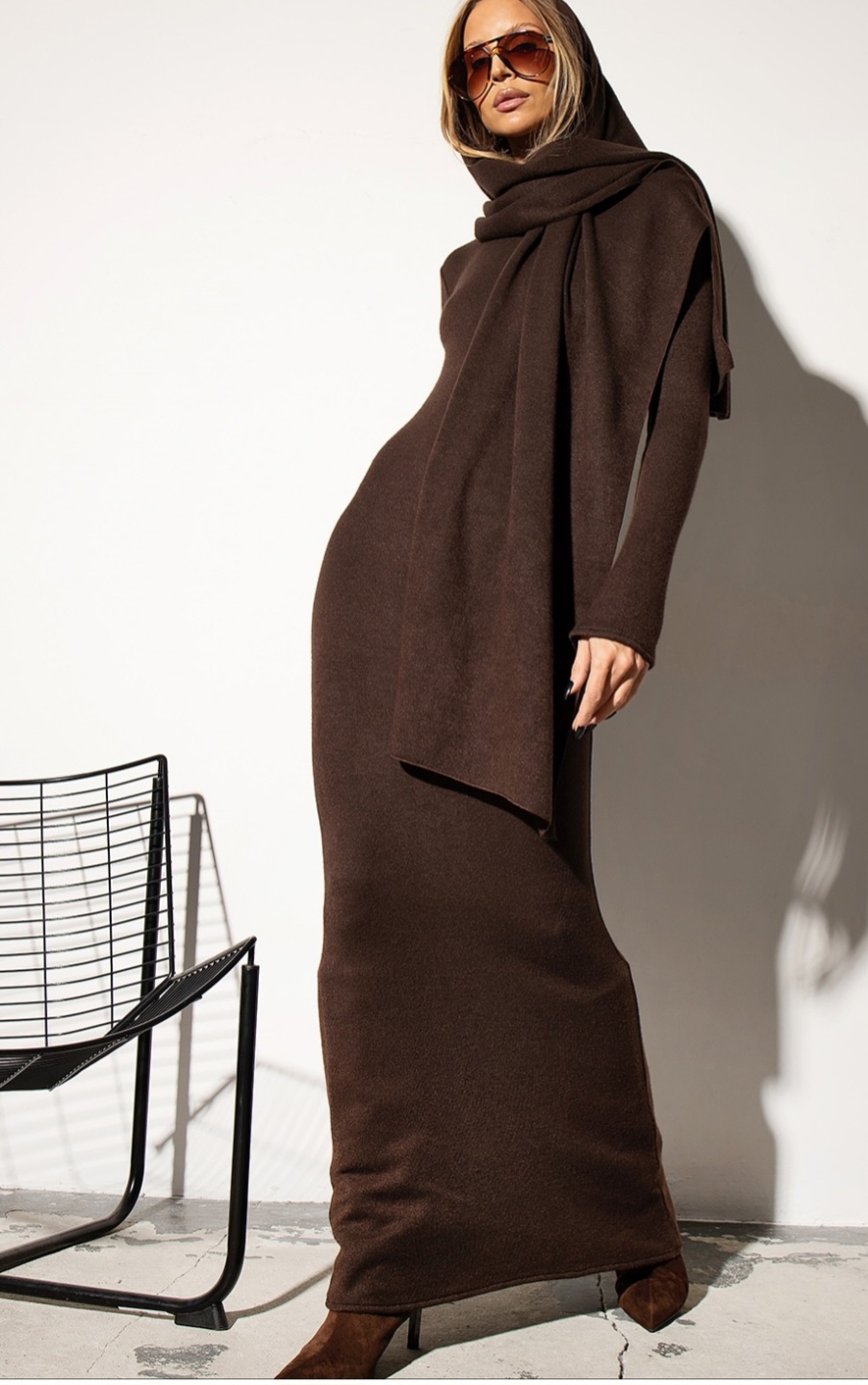 Elegancka dopasowana sukienka o minimalistycznym kroju, wykonana z miękkiej sweterkowej, elastycznej tkaniny, która pięknie podkreśla sylwetkę. Długi rękaw i odkryte plecy dodają jej klasy i subtelnego uroku. Posiada dodatkowy szal, który nadaje stylizacji wyjątkowego charakteru i ponadczasowej elegancji.